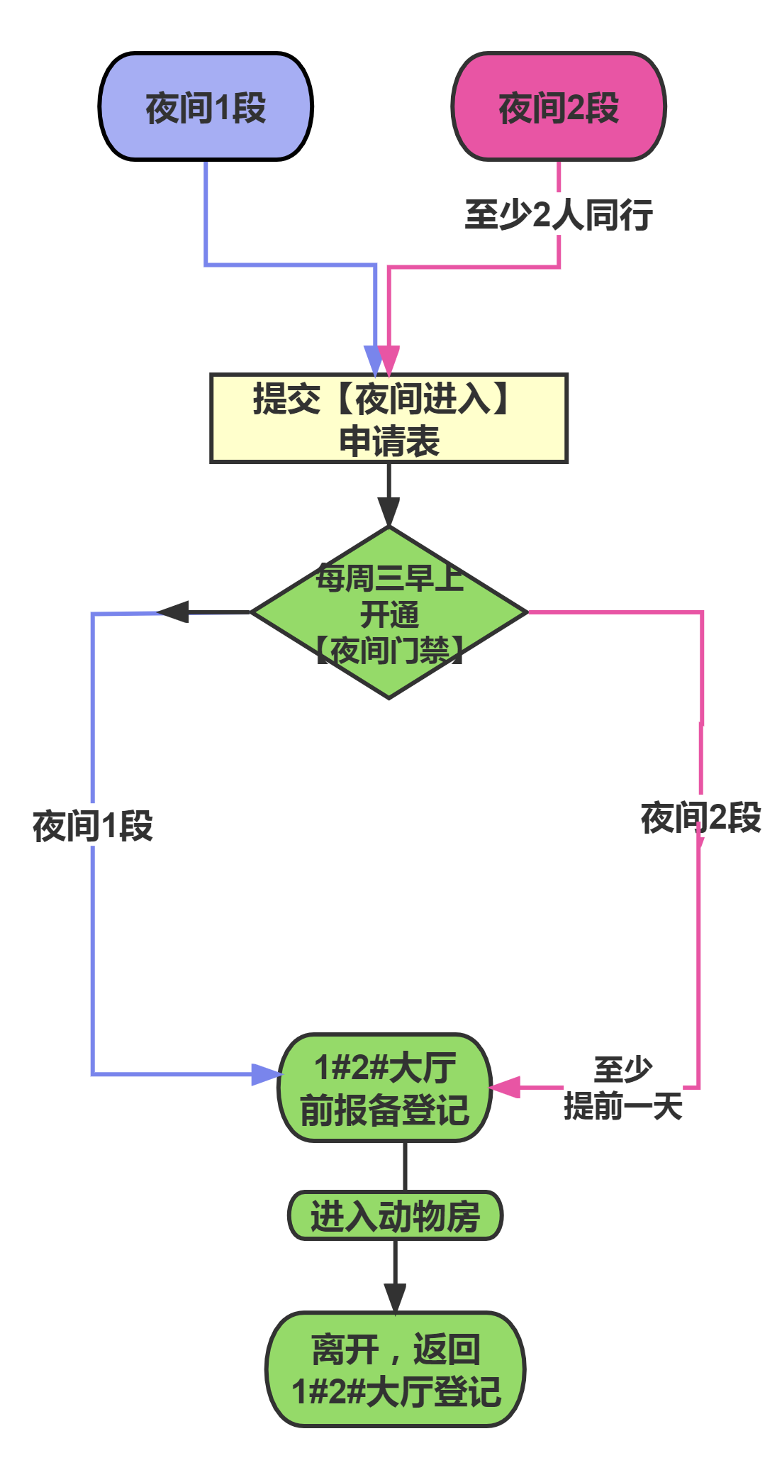 2. 夜间,动物房内人少,夜间安全隐患增加,无必要不进。
