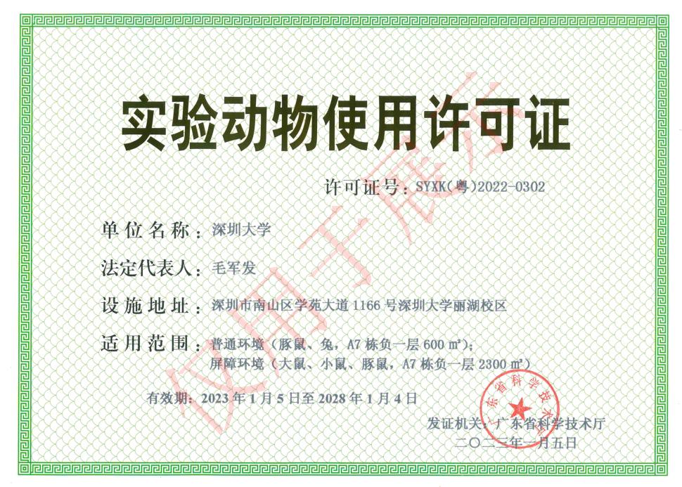 深圳大学实验动物中心(以下简称“动物中心”)是集服务、教学和科研为一体的重要的动物实验公共技术支撑服务平台,其日常运行和管理归口医学部,业务主管归口实验室与国有资产管理部,重大问题由深圳大学实验动物管理委员会协调和决策。动物中心于2023年1月获广东省科技厅颁发《实验动物使用许可证》,总建筑面积近2900平方米,配置有最大为10000笼位数大小鼠独立通气笼位(IVC)、72个兔开放式笼位、双扉高压灭菌器、动物传递氙光传递柜、隧道式洗笼机、动物自动饮水系统等大型仪器设备。动物中心未来规划设置4个子平台:实验动物饲养与实验平台、实验动物质量保障平台、生物净化与技术平台、设施维护保障平台。依托医学部和实验室与国有资产管理部,动物中心在实验动物管理委员会和实验动物伦理委员会(IACUC)指导下,遵守国家和地方实验动物相关法律法规要求,坚持“守正创新担使命、务实奉献促服务”,致力于为我校师生提供专业的实验动物支撑平台和优质服务,为深大高水平大学建设和学科建设添砖加瓦。